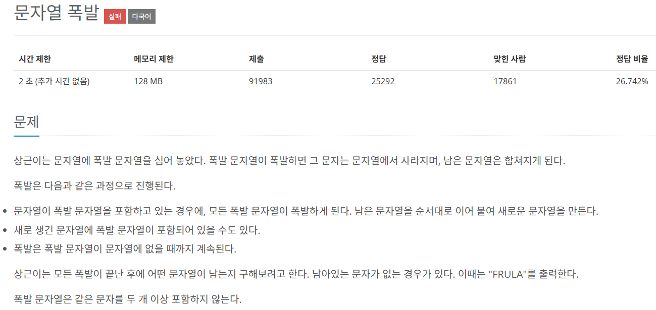 [JAVA] 백준9935: 문자열 폭발(폭발) 문자열 두 개를 입력 받아서, 원래 문자열에서 폭발 문자열이 포함되어 있으면, 폭발 문자열 만큼을 날려달라는 요구인 것 같다. 처음에는 replace() 를 사용해서 풀어보려고 했다.contains()를 사용해서, 원래 문자열이 폭발 문자열이 포함되어 있는지 확인하고,해당 부분을 ""으로 replace하려던 훌륭한 계획이 있었다는 말씀... replace()를 이용한 풀이(틀렸습니다!)public class Main { public static void main(String[] args) throws IOException{ BufferedReader br = new BufferedReader(new InputStreamReader(System.in)); BufferedWri.. 코딩테스트/알고리즘..을 하고 싶었던 2024.11.16