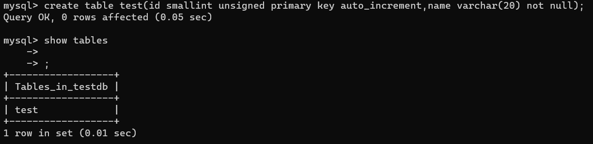 4. create table test(id smallint unsigned primary key auto_incremebt, name varchar(20) not null);