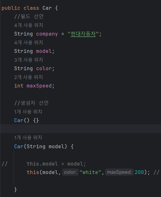 그리고 Car의 객체들을 main메소드에서 인스턴스하기 위해 생성자도 선언해주었다.
