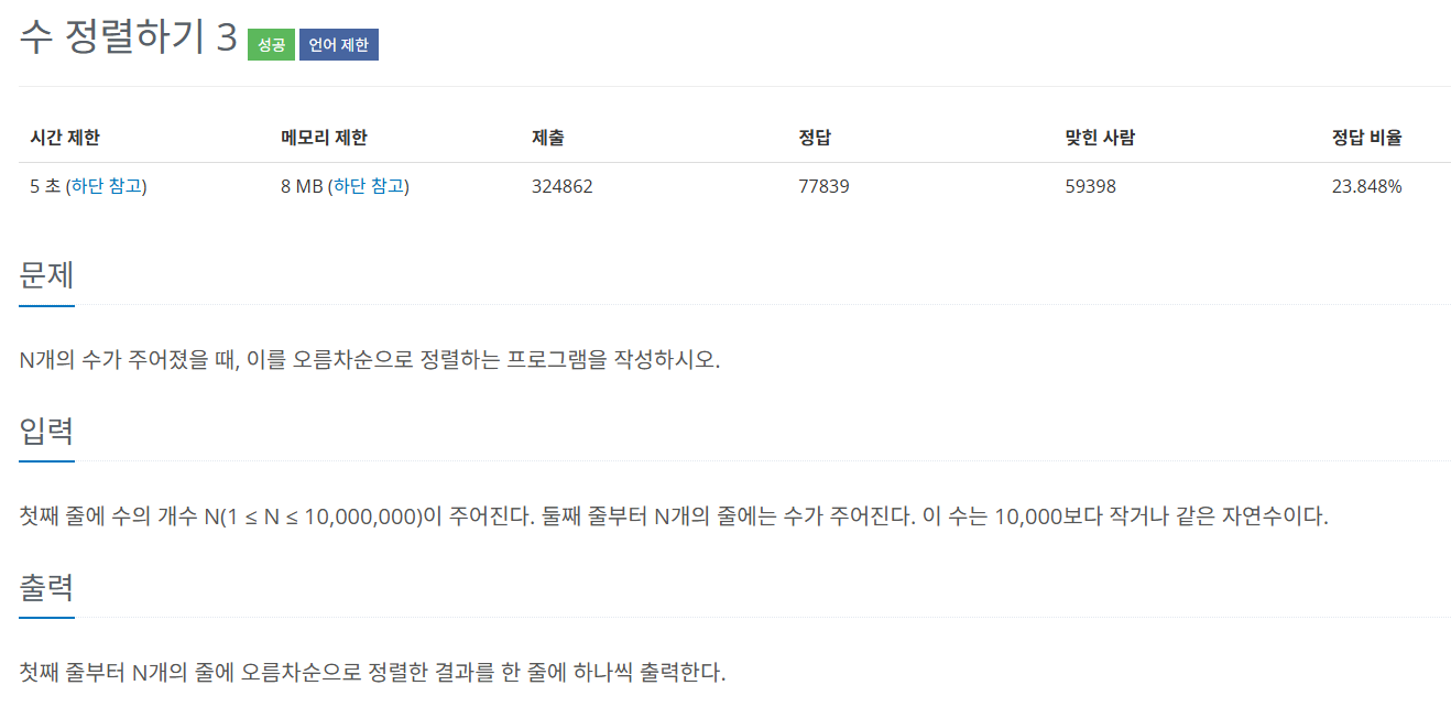 [JAVA] 백준10989: 수 정렬하기 3(시간복잡도 고려) 엄청 쉬운 문제이다.개발자도 아닌데다가 비전공자인 내가 봐도 쉬운 문제이다.입력받은 N번 만큼 반복문 돌려서 배열에 집어넣고, 배열을 오름차순으로 정렬해서 출력하면 된다.sort() 써서 풀면 개쉽잖아. ......라고 생각했었는데, 이건 망할 시간복잡도 고려해야하는 문제였다. 시간 제한 5초라는건 개뻥이었고 사실 3초다.그럼 걍 3초라고 정직하게 써놓던가이씨 할튼 개발자라는놈들은 콧대만 졸라 높아가지고 찐따 같은 녀석들이 말이야 남들 통수나 치고 컴터 앞에 앉아서 애니나 볼줄알지 팍씨 sort()를 사용해서 푼다면, 아주 쉽게 코드를 짤 수 있지만, 무조건BufferedReader와 BufferedWriter를 사용해야한다. 그래야 아슬아슬하게 시간을 맞출 수 있음.저기 시간 조건에는 5초라고 써있지만.. 코딩테스트/알고리즘..을 하고 싶었던 2024.12.02