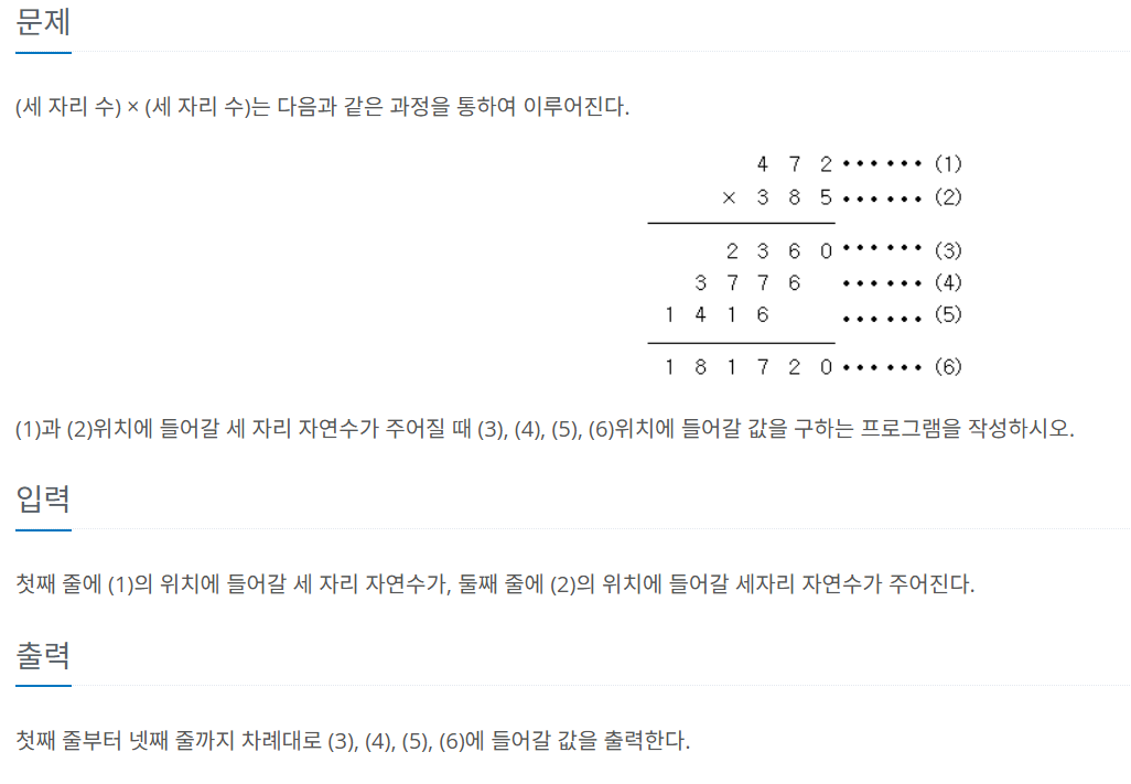 [JAVA] 백준2588: 곱셈 이 문제의 핵심은, 두번째 주어지는 정수를 분리해낼 수 있느냐...? 하는 것이다.아 여러가지 방법이 있을 것 같지만 나는 일단 int로 정수를 받으면 아주 귀찮아질 것 같다는 확신이 강하게 들었다.그래서 아예 두번째 수는 String으로 받기로 했다.그리고 그 문자열을 charAt()을 이용해서 잘라낸 다음 계산하면 아주 간단하게 풀 수 있다. import java.util.Scanner;public class Main { public static void main(String[] args) { Scanner sc = new Scanner(System.in); int a = sc.nextInt(); String b = sc.next(); Syste.. 코딩테스트/알고리즘..을 하고 싶었던 2024.11.04